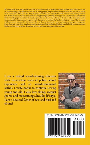 The world needs more educators like you! You are an educator who is looking to up their teaching game. Chances are, you are already making a big difference in the lives of young people, but you also know in your heart that you can do and be more. I wrote Head of the Class: The Art of Teaching Outside the Lines, especially for YOU. I am an award-winning educator with twenty-four years of classroom experience. I struggled mightily through my early years as a teacher for the simple reason that I was underprepared; for both the mental rigors that are inherent to teaching as well as the academic strategies needed to be successful in the classroom. I began to study the masters of the field, the Teacher of the Year winners. They employed a different mindset than me. It is this mindset that is at the core of my book. I wrote it to help you warp speed your practice from wherever it currently is to a place among the superstars of our profession. The book is packed with personal anecdotes, insights, and teaching strategies, all designed to skyrocket your teaching to world-class status.