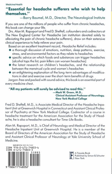 From Simon & Schuster, Headache Relief is a comprehensive, up-to-date, medically proven program that can control and ease headache pain. Emotions, nutrition, sleep patterns, stress, and environmental conditions can all trigger headache pain. Now sufferers can learn to control those factors with this clinically proven program which utilizes medication as well as other forms of relief.