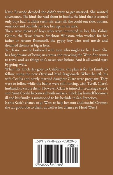 Katie Rexrode decided she didn't want to get married. She wanted adventures. The kind she read about in books, the kind that it seemed only boys had. It didn't seem fair, after all, she could out ride, outrun, outshoot and out fish any boy her age in the area. There were plenty of boys who were interested in her, like Gilroy Gaines, the Texas drover, Stockton Winston, who worked for her father or Arturo Romanoff, the gypsy boy who read novels and dreamed dreams as big as hers. Yet, Katie can't be bothered with men who might tie her down. She has big dreams of being an actress and traveling the West. She wants to travel and see things she's never seen before. And it all would start by going West. When her Uncle Jay goes to California, the plan is for his family to follow, using the new Overland Mail Stagecoach. When he left, his wife Cecilia and newly married daughter Clare were pregnant. They were to follow while the babies were still nursing, with Tyrell, Clare's husband, to escort them. However, Clare is injured in a carriage wreck and Aunt Cecilia becomes ill with malaria. Uncle Jay himself becomes ill and his family is summoned to his bedside in San Francisco. Is this Katie's chance to go West, to help her aunt and cousin? Or must she say good-bye to them, as well as her chance to Head West?