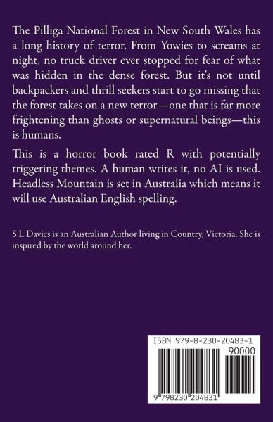 The Pilliga National Forest in New South Wales has a long history of terror. From Yowies to screams at night, no truck driver ever stopped for fear of what was hidden in the dense forest. But it's not until backpackers and thrill seekers start to go missing that the forest takes on a new terror-one that is far more frightening than ghosts or supernatural beings-this is humans. This is a horror book rated R with potentially triggering themes. It is written by a human, no AI is used. Headless Mountain is set in Australia which means it will use Australian English spelling.