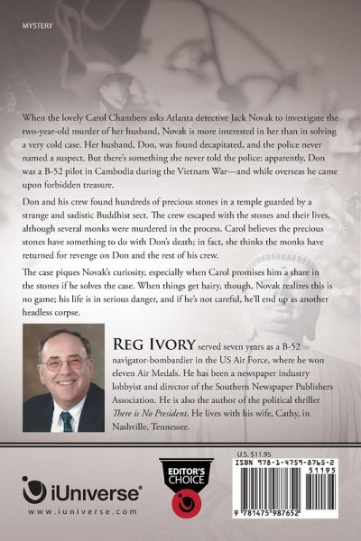 When the lovely Carol Chambers asks Atlanta detective Jack Novak to investigate the two-year-old murder of her husband, Novak is more interested in her than in solving a very cold case. Her husband, Don, was found decapitated, and the police never named a suspect. But there's something she never told the police: apparently, Don was a B-52 pilot in Cambodia during the Vietnam War-and while overseas he came upon forbidden treasure. Don and his crew found hundreds of precious stones in a temple guarded by a strange and sadistic Buddhist sect. The crew escaped with the stones and their lives, although several monks were murdered in the process. Carol believes the precious stones have something to do with Don's death; in fact, she thinks the monks have returned for revenge on Don and the rest of his crew. The case piques Novak's curiosity, especially when Carol promises him a share in the stones if he solves the case. When things get hairy, though, Novak realizes this is no game; his life is in serious danger, and if he's not careful, he'll end up as another headless corpse.
