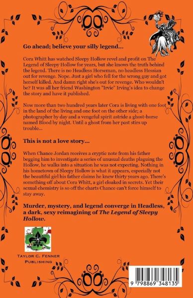 Go ahead; believe your silly legend.... Cora Whitt has watched Sleepy Hollow revel and profit on The Legend of Sleepy Hollow for years, but she knows the truth behind the legend. There is no Headless Horseman, no headless Hessian out for revenge. Nope. Just a girl who fell for the wrong guy and got herself killed. And damn right she's out for revenge. Who wouldn't be? It was all her friend Washington "Irvie" Irving's idea to change the story and have it published. Now more than two hundred years later Cora is living with one foot in the land of the living and one foot on the other side; a photographer by day and a vengeful spirit astride a ghost-horse named Blood by night. Until a ghost from her past stirs up trouble... This is not a love story... When Chance Jordan receives a cryptic note from his father begging him to investigate a series of unusual deaths plaguing the Hollow, he walks into a situation he was not expecting. Nothing in his hometown of Sleepy Hollow is what it appears, especially not the beautiful girl his father claims he knew thirty years ago. There's something off about Cora Whitt, a girl cloaked in secrets. Yet their sexual chemistry is so off the charts Chance can't force himself to stay away. Murder, mystery, and legend converge in Headless, a dark, sexy reimagining of The Legend of Sleepy Hollow.