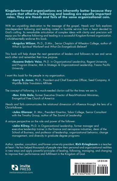 Your life depends on organizations. God created you in his image for purposeful relationships. No human can thrive, or ultimately even survive, in isolation. From the small groups like a nuclear family, church, or school to large secular companies, and the government, every such purposeful group of people is, by definition, an organization where everything is done by someone who is following or leading, and often both. These interdependent roles are equally important heads and tails of the organizational coin. The Kingdom of God has two realms of organizations. The heavenly realm is perfectly organized, so when Jesus taught his followers to pray, he told them to pray for God's Kingdom to come soon on earth as it is now in heaven. Later he repeated that instruction even more strongly and with a promise: seek the Kingdom of God above everything else, and he will give you everything you need. How do you bring Kingdom principles into every kind of organization, with following and leading equally valued under the perfect leadership of King Jesus? The heavenly realm provides the organizational and relational ideal for all organizations in the earthly realm, so the following and leading roles can be filled with maximum effectiveness. In the present earthly realm, Kingdom-formed organizations function as much as possible like the ideal model of the coming Kingdom of Jesus Christ. Thus, in a heavily leader-centric world, extra-intentional effort must focus on the development of highly effective followership and truly humble leadership. Heads and Tails provides principles, illustrations, a practical framework, meditations, and challenging questions for a mindset that guides actions great and small to make following and leading in any kind of organization more like the coming Kingdom of God.
