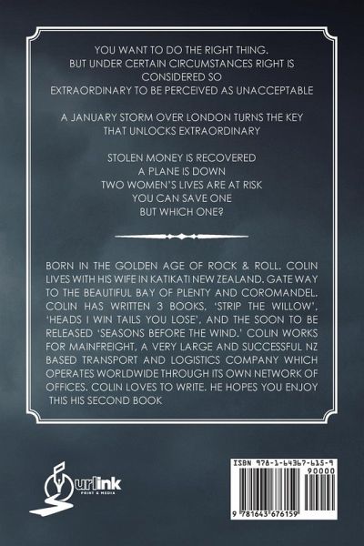 YOU WANT TO DO THE RIGHT THING. BUT UNDER CERTAIN CIRCUMSTANCES RIGHT IS CONSIDERED SO EXTRAORDINARY TO BE PERCEIVED AS UNACCEPTABLE A JANUARY STORM OVER LONDON TURNS THE KEY THAT UNLOCKS EXTRAORDINARY STOLEN MONEY IS RECOVERED A PLANE IS DOWN TWO WOMEN’S LIVES ARE AT RISK YOU CAN SAVE ONE BUT WHICH ONE?