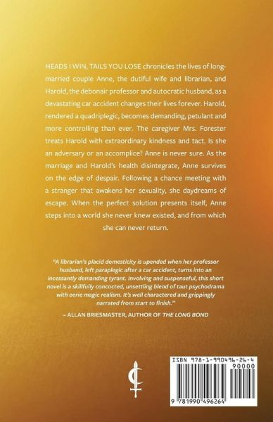 Heads I Win, Tails You Lose chronicles the lives of long-married couple Anne, the dutiful wife and librarian, and Harold, the debonair professor and autocratic husband, as a devastating car accident changes their lives forever. Harold, rendered a quadriplegic, becomes demanding, petulant and more controlling than ever. The caregiver Mrs. Forester treats Harold with extraordinary kindness and tact. Is she an adversary or an accomplice? Anne is never sure. As the marriage and Harold's health disintegrate, Anne survives on the edge of despair. Following a chance meeting with a stranger that awakens her sexuality, she daydreams of escape. When the perfect solution presents itself, Anne steps into a world she never knew existed, and from which she can never return.