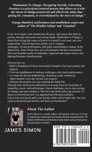 Every river begins with a headwater, the pure, vital source that fuels its journey through calm pools and roaring rapids. Headwaters to Change is about discovering that source of power in yourself, your team, and your organization. This driving force pushes you to conquer challenges, elevate performance, and ignite transformative change. In his debut book, James Simon lays out core principles that have consistently delivered tangible results in leadership, organizational improvement, and high-performance transformation. Discover how to: 1. * Build a foundation of focus and mental strength to fuel your journey and purpose. * Cultivate mindfulness to embrace challenges with clarity and presence. * Leverage the Kaizen methodology of making small, continuous improvements every day toward your purpose. * Embrace the process over just reaching the finish line. Through real-world stories and hard-won lessons from the front lines of leadership, sports, and performance, Simon challenges you to stop waiting for change and start creating it. This isn't just about achieving success; it's about revolutionizing how you approach growth and excellence. Like a river carving its path, your journey starts with a single step. Are you ready to break through barriers and find your headwaters?