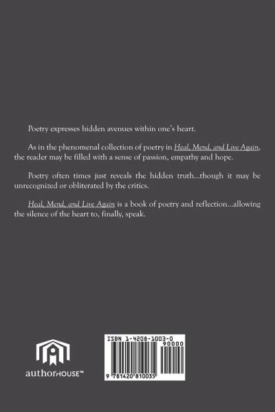 Poetry expresses hidden avenues within one's heart. As in the phenomenal collection of poetry in Heal, Mend, and Live Again, the reader may be filled with a sense of passion, empathy and hope. Poetry often times just reveals the hidden truth.though it may be unrecognized or obliterated by the critics. Heal, Mend, and Live Again is a book of poetry and reflection.allowing the silence of the heart to, finally, speak.