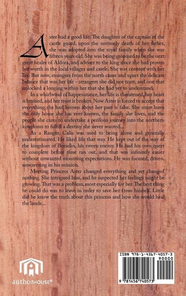 Aster had a good life. The daughter of the captain of the castle guard, upon the untimely death of her father, she was adopted into the royal family when she was fifteen years old. She was being groomed to be the next great healer of Aldora, and adviser to the king since she had proven her worth in the local villages and castle. She was content with her life. But now, strangers from the north came and upset the delicate balance that was her life - strangers she did not trust, and one that unlocked a longing within her that she had yet to understand. In a whirlwind of happenstance, her life is threatened, her heart is bruised, and her trust is broken. Now Aster is forced to accept that everything she had known about her past is false. She must leave the only home she has ever known, the family she loves, and the people she cares to undertake a perilous journey into the northern kingdoms to fulfill a destiny she never wanted... As a Ranger, Calis was used to being alone and generally underestimated. He liked life that way. He kept out of the way of the kingdom of Boradin, his sworn enemy. He had his own quest to complete before time ran out, and that was infinitely easier without unwanted mounting expectations. He was focused, driven, unwavering in his mission. Meeting Princess Aster changed everything and yet changed nothing. She intrigued him, and he suspected her feelings might be growing. That was a problem, most especially for her. The best thing he could do was to leave in order to save her from himself. Little did he know the truth about this princess and how she would heal the lands...