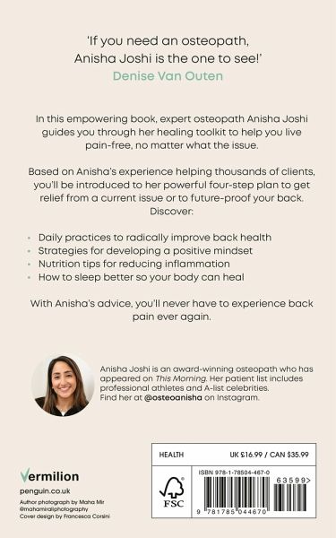 "Packed with real-life anecdotes and case studies, drawn from Anisha Joshi's extensive experience as an osteopath, Heal Your Back will relieve your pain, take charge of your symptoms and future-proof your health! Back pain can adversely affect quality of life. Around 80 per cent of us experience lower back pain at some point, and it is the chief cause of disability among those under 45 in the UK, contributing to missed work days, mental health decline and long NHS waiting lists. Starting with the basics of understanding how your back works and moving through the different types of back pain, as well as the causes and symptoms, Anisha will draw on her years of experience in clinic to show you how you can manage your symptoms and bulletproof your back using a simple four-step approach: Keep moving; Change your mindset; Eat well; Sleep. Using evidence-based research, award-winning osteopath Anisha will help you to understand the real causes of back pain (often not what we might think), and offers practical, everyday advice to help you take care of your back, overcome your pain and live a healthier, happier, pain-free life"--Amazon.com.