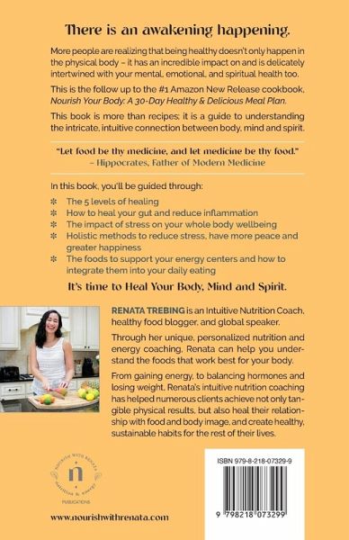 This book is going to change the nutrition industry! I've never read a book about nutrition that so thoughtfully connects the dots on how food fits into our overall health picture like this book does. Renata has a fresh, unique perspective that is missing from the health industry and this book provides a beautiful model for anyone searching for answers to discover missing pieces to their health, want to learn a different approach to nutrition, or are curious about learning about their body on a deeper, more holistic level.- Dr. Samantha Chernak, DPT, Holistic Physical Therapist and Women's Strength Coach. There is an awakening happening. More people are realizing that being healthy doesn't only happen in the physical body - it has an incredible impact and is delicately intertwined with your mental, emotional and physical health too. This is the follow up to the #1 Amazon New Release cookbook, Nourish Your Body: A 30 Day Healthy & Delicious Meal Plan. This book is more than recipes; it is a guide to understanding the intricate and intuitive connection between the body, mind and spirit. "Let food be thy medicine, and let medicine be thy food." - Hippocrates, Father of Modern Medicine. When health and healing occur on a physical level, it has a profound effect on all areas of You, to create your happiest and healthiest Self. In this book, you'll be guided through: The 5 levels of healing; How to heal your gut and reduce inflammation; The impact of stress on your whole body wellbeing; Holistic methods to reduce stress, have more peace and greater happiness; The foods to support your energy centers and how to integrate them into your daily eating. It's time to Heal Your Body, Mind and Spirit.