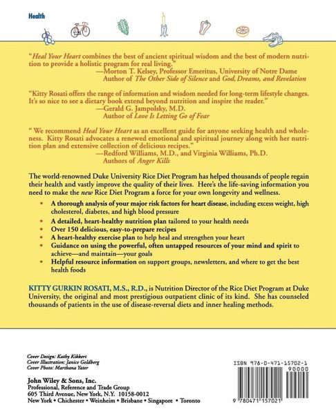 "Heal Your Heart combines the best of ancient spiritual wisdom and the best of modern nutrition to provide a holistic program for real living." -- Morton T. Kelsey, Professor Emeritus, University of Notre Dame Author of The Other Side of Silence and God, Dreams, and Revelation "Kitty Rosati offers the range of information and wisdom needed for long-term lifestyle changes. It's so nice to see a dietary book extend beyond nutrition and inspire the reader." -- Gerald G. Jampolsky, M.D. Author of Love Is Letting Go of Fear " We recommend Heal Your Heart as an excellent guide for anyone seeking health and wholeness. Kitty Rosati advocates a renewed emotional and spiritual journey along with her nutrition plan and extensive collection of delicious recipes." -- Redford Williams, M.D., and Virginia Williams, Ph.D. Authors of Anger Kills The world-renowned Duke University Rice Diet Program has helped thousands of people regain their health and vastly improve the quality of their lives. Here's the life-saving information you need to make the new Rice Diet Program a force for your own longevity and wellness. A thorough analysis of your major risk factors for heart disease, including excess weight, high cholesterol, diabetes, and high blood pressure A detailed, heart-healthy nutrition plan tailored to your health needs Over 150 delicious, easy-to-prepare recipes A heart-healthy exercise plan to help heal and strengthen your heart Guidance on using the powerful, often untapped resources of your mind and spirit to achieve--and maintain--your goals Helpful resource information on support groups, newsletters, and where to get the best health foods