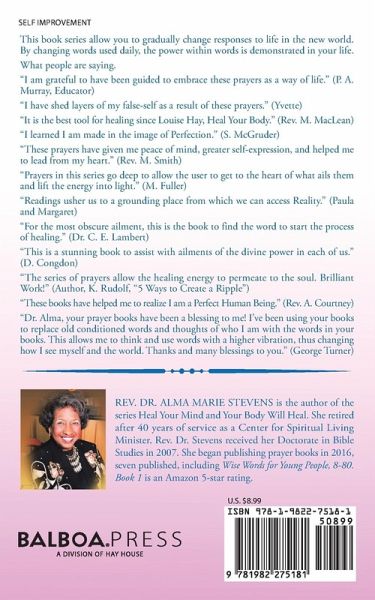 This book series allow you to gradually change responses to life in the new world. By changing words used daily, the power within words is demonstrated in your life. What people are saying. "I am grateful to have been guided to embrace these prayers as a way of life." (P. A. Murray, Educator) "I have shed layers of my false-self as a result of these prayers." (Yvette) "It is the best tool for healing since Louise Hay, Heal your Body." (Rev. M. MacLean) "I learned I am made in the image of Perfection." (S. McGruder) "These prayers have given me peace of mind, greater self-expression, and helped me to lead from my heart." (Rev. M. Smith) "Prayers in this series go deep to allow the user to get to the heart of what ails them and lift the energy into light." (M. Fuller) "Readings usher us to a grounding place from which we can access Reality." (Paula and Margaret) "For the most obscure ailment, this is the book to find the word to start the process of healing." (Dr. C. E. Lambert) "This is a stunning book to assist with ailments of the divine power in each of us." (D. Congdon) "The series of prayers allow the healing energy to permeate to the soul. Brilliant Work!" (Author, K. Rudolf, "5 Ways to Create a Ripple") "These books have helped me to realize I am a Perfect Human Being." (Rev. A. Courtney) "Dr. Alma, you're a prayer books have been a blessing to me! I've been using your books to replace my old conditioned words and thoughts of who I am with the words in your books. This allows me too think and use words with a higher vibration, thus changing how I see myself and the world. I have a lot of work to do but I am committed to the process of transforming my reality. Thanks and many blessings to you" (George Turner )