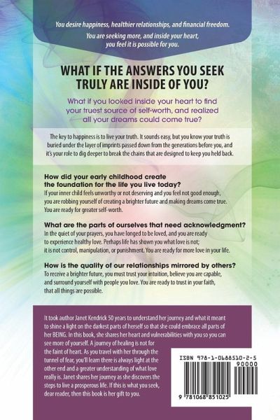 You desire happiness, healthier relationships, and financial freedom.You are seeking more, and inside your heart, you feel it is possible for you. What if the answers you seek truly are inside of you? What if you looked inside your heart to find your truest source of self-worth, and realized all your dreams could come true? The key to happiness is to live your truth. It sounds easy, but you know your truth is buried under the layer of imprints passed down from the generations before you, and it's your role to dig deeper to break the chains that are designed to keep you held back. How did your early childhood create the foundation for the life you live today? If your inner child feels unworthy or not deserving and you feel not good enough, you are robbing yourself of creating a brighter future and making dreams come true. You are ready for greater self-worth. What are the parts of ourselves that need acknowledgment? In the quiet of your prayers, you have longed to be loved, and you are ready to experience healthy love. Perhaps life has shown you what love is not; it is not control, manipulation, or punishment. You are ready for more love in your life. How is the quality of our relationships mirrored by others? To receive a brighter future, you must trust your intuition, believe you are capable, and surround yourself with people you love. You are ready to trust in your faith, that all things are possible. It took author Janet Kendrick 50 years to understand her journey and what it meant to shine a light on the darkest parts of herself so that she could embrace all parts of her BEING. In this book, she shares her heart and vulnerabilities with you so you can see more of yourself. A journey of healing is not for the faint of heart. As you travel with her through the tunnel of fear, you'll learn there is always light at the other end and a greater understanding of what love really is. Janet shares her journey as she discovers the steps to live a prosperous life. If this is what you seek, dear reader, then this book is her gift to you.