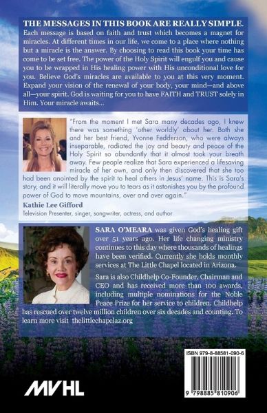 Sara O'Meara was born Sara Buckner in Knoxville, Tennessee and was educated at Briarcliff Junior College, New York; Endicott College, Massachusetts; The Sorbonne, France; and Pasadena Playhouse, California. Sara lives in Paradise Valley, Arizona. She has a son, John Hopkins. Her other son, Chuck, passed away in 1988 in an auto accident. Sara also has a daughter, Taryn, and three grandchildren. Sara lost her husband Colonel Robert (Bob) Sigholtz in 2005. Bob was a highly decorated Colonel who fought in three wars-World War II, the Korean War, and the Vietnam War. He was also the Athletic Director of Georgetown University.As Childhelp Co-Founder, Chairman, and CEO Sara O'Meara is actively involved in the development and oversight of the organization. Sara serves as the organization's key spokesperson and is primarily responsible for fund development and overall oversight of the organization's business. She has served on the boards of international organizations concerned with child welfare. As a board member for the International Union for Child Welfare, she was the sole United States representative among First Ladies and ministers of numerous nations. She also served as chairman of the International Alliance of Child Abuse and Neglect.Sara has received more than 100 awards for her service to children, including the Arizona Foundation for Women's Sandra Day O'Connor Award and Most Dynamic Woman of the Year award from Clarins USA. Others include an award for international collaboration to prevent child abuse presented by Queen Elizabeth II of the United Kingdom; a U.S. Department of Justice award presented by President Ronald Reagan; the Kiwanis World Service Medal, the Global Women's Summit Award, Family Circle magazine's Women of the Year, and an award from the National Federation of Business and Professional Women's Clubs. She has been the recipient of several awards in Washington, D.C., including the Congressional Angels in Adoption Award, National Caring Award, the Hubert Humphrey Memorial Award at the Touchdown Club, and the Lifetime Achievement Award at the National Charity Awards Dinner. Sara, along with Co-Founder Yvonne Fedderson, have been nominated several times for the Nobel Peace Prize. Endorsements for the prestigious nomination include letters from U.S. Supreme Court Justice Sandra Day O'Connor and former First Lady Barbara Bush, along with numerous politicians, educators, and corporate executives. A papal recognition and recent Humanitarian Award by the Interfaith Movement demonstrates the intersection of service and faith. Most recent accolades include a Golden Rule Humanitarian Award by the Interfaith Movement, the Foundation for Global Sports Development Humanitarian Award, and the Stanford University Hall of Fame Award.Sara O'Meara was given God's healing gift over fifty-one years ago. Her life-changing ministry continues to this day where thousands of healings have been verified. Currently she holds monthly services at The Little Chapter located in Paradise Valley, AZ.Sara is also Childhelp Co-Founder, Chairman and CEO and has received more than 100 awards, including multiple nominations for the Noble Peace Prize for her service to children. Childhelp has rescued over twelve million children over six decades and counting.Sara's prayer is that the holder of this book will be blessed upon turning that first page. To learn more, visit thelittlechapelaz.org.