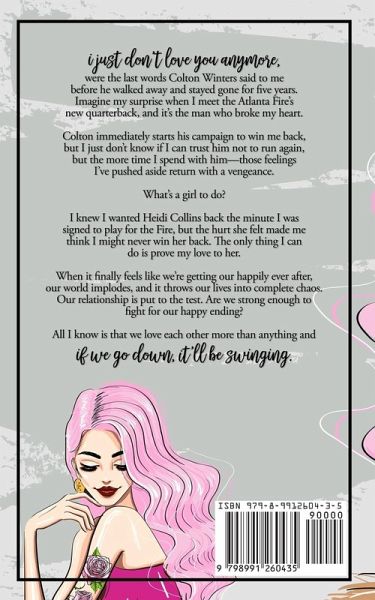 I just don't love you anymore, were the last words Colton Winters said to me before he walked away and stayed gone for five years. Imagine my surprise when I meet the Atlanta Fire's new quarterback, and it's the man who broke my heart. Colton immediately starts his campaign to win me back, but I just don't know if I can trust him not to run again, but the more time I spend with him-those feelings I've pushed aside return with a vengeance. What's a girl to do? I knew I wanted Heidi Collins back the minute I was signed to play for the Fire, but the hurt she felt made me think I might never win her back. The only thing I can do is prove my love to her. When it finally feels like we're getting our happily ever after, our world implodes, and it throws our lives into complete chaos. Our relationship is put to the test. Are we strong enough to fight for our happy ending? All I know is that we love each other more than anything and if we go down, It'll be swinging.