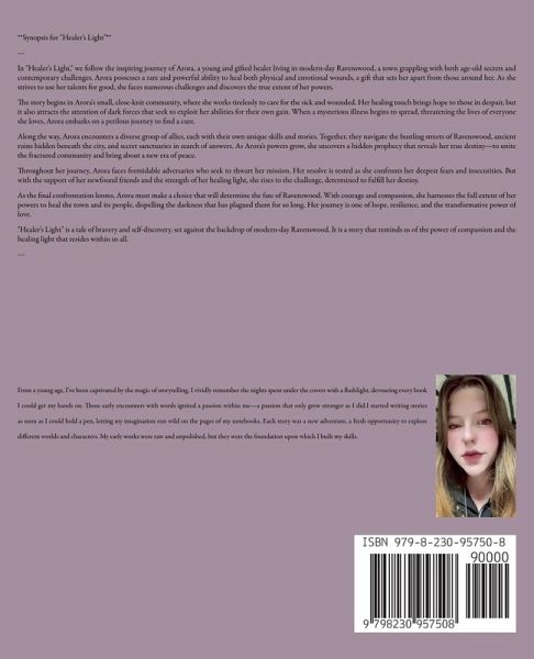 **Synopsis for "Healer's Light"** --- In "Healer's Light," we follow the inspiring journey of Arora, a young and gifted healer living in modern-day Ravenswood, a town grappling with both age-old secrets and contemporary challenges. Arora possesses a rare and powerful ability to heal both physical and emotional wounds, a gift that sets her apart from those around her. As she strives to use her talents for good, she faces numerous challenges and discovers the true extent of her powers. The story begins in Arora's small, close-knit community, where she works tirelessly to care for the sick and…mehr