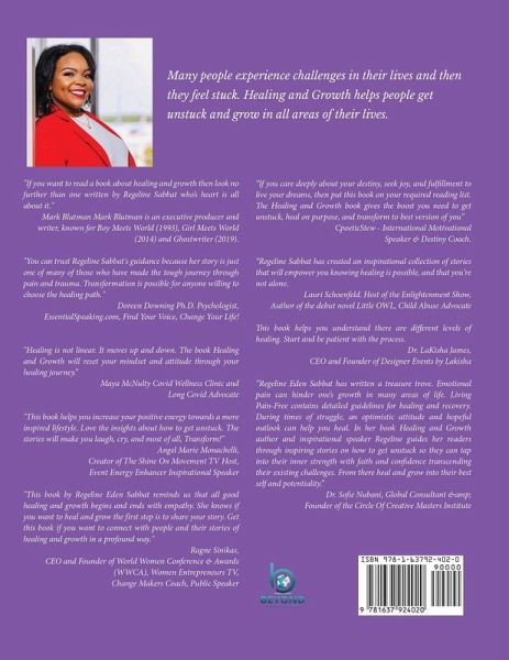 Many people experience challenges in their lives and then they feel stuck. Healing and Growth helps people get unstuck and grow in all areas of their lives. "If you want to read a book about healing and growth then look no further than one written by Regeline Sabbat who's heart is all about it." Mark Blutman Mark Blutman is an executive producer and writer, known for Boy Meets World (1993), Girl Meets World (2014) and Ghostwriter (2019). "You can trust Regeline Sabbat's guidance because her story is just one of many of those who have made the tough journey through pain and trauma. Transformation is possible for anyone willing to choose the healing path." Doreen Downing Ph.D. Psychologist EssentialSpeaking.com Find Your Voice, Change Your Life! "I've tried hypnosis, CBT, beta blockers, meditation, avoidance, memorization & more. None has helped as much as Doreen." Amanda Kim, Writer "Healing is not linear. It moves up and down. The book Healing and Growth will reset your mindset and attitude through your healing journey.'' Maya McNulty Covid Wellness Clinic and Long Covid Advocate Co-Authors include: Gigi Sabbat Guerline Sabbat Heidi-Marie Ferren Kya Wolf Erica Lopez Joe Nicassio Kimberly Garcia Brandee Thunberg Kelly Haugh Kristie Lynn Erin Baer Pat Alva Kraker Tonni Lea Michelle and Mason Harvey Irtashia Horn CJ GRACE Mindy East Angel M Savoy Navi Bliss Dr. Tanya Gold Dr. Rosalind Willis Annie Koshy Kellan Fluckiger Chris Salem Joy Brown Christie Love Dr. Ntsiki Ncoco Molika Gupta Dr. Angelica Benavides Manny Blue Pamela Aubrey Pastor ILona Parunakova Sheryl Puterman Missy Maxwell Worton Beata Seweryn-Reid Derron Rowan Elizabeth Bull Mark Stephen Pooler Grady Taylor Dylan Christopher Dr. Amber Lyons Diane Halfman Alexa Oliva Doree O'Neal Melanie Fusilier Frantz Andre Tonja Anderson-Dell Lori K Baird Dr. Ukpong Nwankwo Althea Richardson Stephan Neff Stanitra Robinson Reggie Smith Ben Swicegood Maria Angelova Michal (Michelle) Guelfand Dr. Radley Ramdhan Joy Allen Lorrel Elian Toolika Rani Mark Ledlow Dr.Shenetta Malkia Lynda Sunshine West Joyonna Gamble-George, MHA, PhD Trent Denman Jacquie Branagan Lesley Jones Sessler Jamie Whitfield Monika Levenson Annie J. Allen Dr. Yan Leyfman Shannon Primer Paula Husovsky, M. Curtis McCoy, Pastor Nadine Grigsby