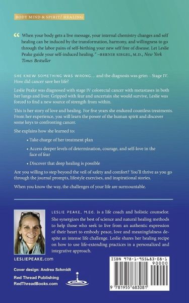 She knew something was wrong... ...and the diagnosis was grim - Stage IV. How did cancer save her life? Leslie Peake was diagnosed with stage IV colorectal cancer with metastasis in both lungs and her liver. Gripped with fear, overwhelmed, and uncertain she would survive, Leslie was forced to find a new source of strength from within herself. This is her story of love and healing. For five years she endured countless treatments and along the way learned about the power of the human spirit, but more than that, she discovered some keys to confronting cancer. She explains how she learned to: - be in charge of the treatment plan.- access deeper levels of determination, courage, and self-love.- face the darkness- discover that deep healing is possible- and much more. Are you willing to step beyond the veil of safety and comfort? You'll thrive as you go through the journal prompts, lifestyle exercises, and inspirationalstories. When you know the way, the challenges of your life are surmountable.