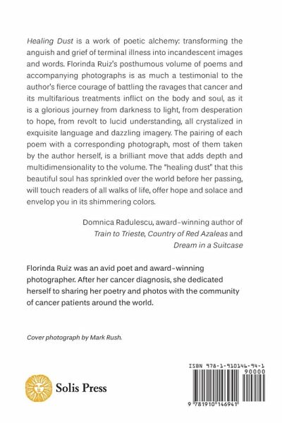 Florinda Ruiz was an avid poet and award-winning photographer. After her cancer diagnosis, she dedicated herself to sharing her poetry and photos with the community of cancer patients around the world. "Healing Dust is a work of poetic alchemy: transforming the anguish and grief of terminal illness into incandescent images and words. Florinda Ruiz's posthumous volume of poems and accompanying photographs is as much a testimonial to the author's fierce courage of battling the ravages that cancer and its multifarious treatments inflict on the body and soul, as it is a glorious journey from darkness to light, from desperation to hope, from revolt to lucid understanding, all crystalized in exquisite language and dazzling imagery. The pairing of each poem with a corresponding photograph, most of them taken by the author herself, is a brilliant move that adds depth and multidimensionality to the volume. The "healing dust" that this beautiful soul has sprinkled over the world before her passing, will touch readers of all walks of life, offer hope and solace and envelop you in its shimmering colors."-Domnica Radulescu, award-winning author of Train to Trieste, Country of Red Azaleas and Dream in a Suitcase.