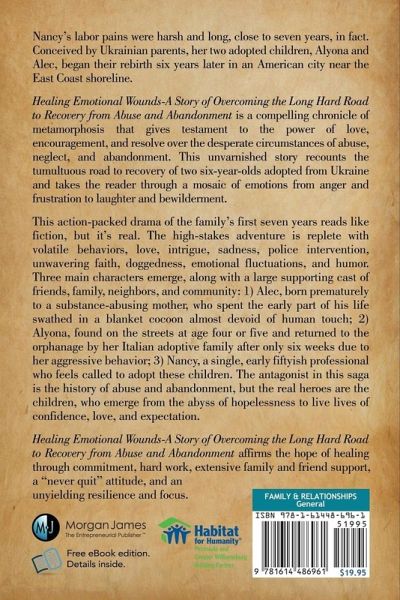 Russia banned the United States from adopting from their country, and subsequently a flurry of media stories brought attention to the prevalence of severe behavioral and emotional disorders in children adopted from Eastern European orphanages. Schoolchildren and moviegoers are shot and killed in the United States by persons described as mentally ill since childhood, and we as a nation question our recognition and treatment of emotionally disturbed children. Healing Emotional Wounds-A Story of Overcoming the Long Hard Road to Recovery from Abuse and Abandonment brings the reader face-to-face with the challenges of healing the wounds of abuse, neglect, and abandonment of two six-year-olds adopted from Ukraine. It is often not a very pretty sight, but literally through blood, sweat, and tears the family emerges as a healthy, bonded unit. This story affirms the hope of healing through commitment, hard work, extensive family and friend support, a "never quit" attitude, and an unyielding resilience and focus. The intent of this book is to inspire endurance, professional and community support, intervention, and hope. The intent is to save these children.