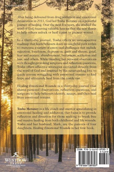 After being delivered from drug addiction and emotional devastation in 2011, God led Tosha Mcraney on a powerful journey of healing. Over the next five years, she studied the word of God, receiving valuable lessons that she now shares to help others unlock or heal a past or present wound. In a thirty-day journal, Tosha offers an introspective roadmap that leads believers down an insightful path within to overcome a variety of emotional challenges that include rejection, loneliness, depression, guilt and shame, grief, fear and anxiety, abandonment, bitterness, addiction and lust, and others. While blending her personal observations with thought-provoking scripture and reflection questions, Tosha offers effective strategies extracted directly from the word of God and inspired by His never-ending love to guide anyone struggling with emotional trauma to find hope and ultimately heal from the inside out. Healing Emotional Wounds is a thirty-day journal that shares personal observations, reflection questions, and scripture to help believers identify, accept, and then heal from emotional trauma.