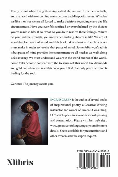 Ready or not while living this thing called life, we are thrown curve balls, and are Faced with overcoming many detours and disappointments. Whether we like it Or not we are all forced to make decisions regarding every. day life Circumstances? Have you ever felt confused or overwhelmed by the choices You've made in life? If so, what do you do to resolve these feelings? Where do you find the strength, you need when making choices in life? We Are all searching for peace of mind and this book takes a look at the choices We must make in order to receive that peace of mind. Some folks won't admit It but peace of mind provides the contentment we all need as we walk along Life's journey. We must understand we are in the world but not of the world. Some folks become content with the treasures of this world like diamonds and Gold but when you read this book you'll find that only peace of mind is healing For the soul. Curious? The journey awaits you.