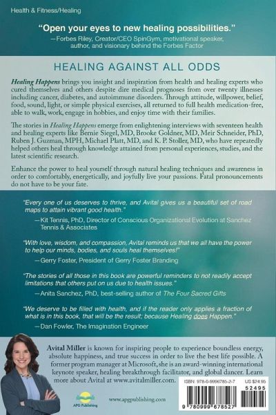 Imagine healing a chronic condition or terminal illness against all odds by making one simple change. Healing Happens brings you insight and inspiration from health and healing experts who cured themselves and others despite dire medical prognoses from over twenty illnesses ranging from cancer, diabetes, and multiple sclerosis to Hashimoto’s, hypothyroidism, bipolar personality disorder, stroke, musculoskeletal pain, blindness, ADHD, obesity, fibromyalgia, hepatitis C, cerebral palsy, and anxiety. Enhance the power to heal yourself through natural healing techniques and awareness in order to comfortably, energetically, and joyfully live your passions. Some of the people in the stories in this book were in wheelchairs or expecting to undergo major surgery, while others had been on medication most of their lives or in hospice expecting to die. Through attitude, willpower, belief, food, sound, light, or simple physical exercises, all returned to full health medication-free, able to walk, work, engage in hobbies, and enjoy time with their families. The stories in Healing Happens emerge from enlightening interviews with seventeen health and healing experts: Bernie Siegel, MD, Brooke Goldner, MD, Meir Schneider, PhD, Ruben J. Guzman, MPH, Nicole DeAvilla, Michael Platt, MD, K. P. Stoller, MD, Tara Gesling, Tryshe Dhevney, Maureen Belle, Gail Lynn, Connie Hernandez, ND, Mamie Lamley, Bhavna Srivastava, Sam Shelley, Mary Wutz, and Peter Leach. They have repeatedly helped others heal through knowledge attained from personal experiences, studies, and the latest scientific research. Their specialties range from Western medicine to naturopathy, yoga therapy, physical therapy, nutrition, herbal medicine, sound healing, energy healing, meditation, and spirituality. They reveal there are more possibilities for healing than are commonly known. Avital Miller, former program manager at Microsoft and yoga and fitness trainer, has been sharing natural healing techniques ever since they radically improved her situation with Hashimoto’s and hypothyroidism. Discovering there were many stories of healing against all odds, she saw the importance of collecting such stories to inform people about their potential for overcoming seemingly insurmountable health challenges. Discover the most profound wisdom and techniques for gaining more power over your health and healing. Fatal pronouncements do not have to be your fate.