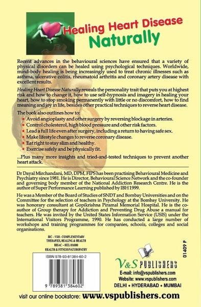 Recent advances in the behavioural sciences have ensured that a variety of physical disorders can be healed using psychological techniques. In fact,worldwide, mind-body healing is being increasingly used to treat chronic illnesses such as asthma, ulcerative colitis, rheumatoid arthritis and coronary artery disease with excellent results. This book reveals the personality trait that puts you at highest risk and how to change it, how to use self-hypnosis and imagery in healing your heart, how to stop smoking permanently with little or no discomfort, how to find meaning and joy in life, besides other practical techniques to reverse heart disease. The book also outlines how to: *Avoid angioplasty and other surgery by reversing blockage in arteries. *Control cholesterol, high blood pressure and other risk factors. *Lead a full life even after surgery, including a return to having safe sex. *Make lifestyle changes to reverse coronary disease. *Eat right to stay slim and healthy. *Exercise safely and be physically fit. ...plus many more insights and tried-and-tested techniques to prevent another heart attack.
