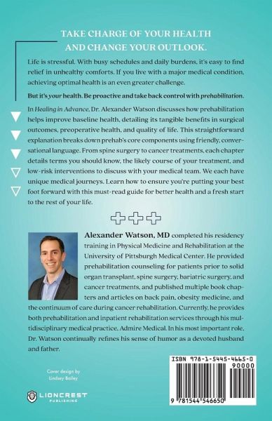 Take charge of your health and change your outlook. Life is stressful. With busy schedules and daily burdens, it's easy to find relief in unhealthy comforts. If you live with a major medical condition, achieving optimal health is an even greater challenge. But it's your health. Be proactive and take back control with prehabilitation. In Healing in Advance, Dr. Alexander Watson discusses how prehabilitation helps improve baseline health, detailing its tangible benefits in surgical outcomes, preoperative health, and quality of life. This straightforward explanation breaks down prehab's core components using friendly, conversational language. From spine surgery to cancer treatments, each chapter details terms you should know, the likely course of your treatment, and low-risk interventions to discuss with your medical team. We each have unique medical journeys.