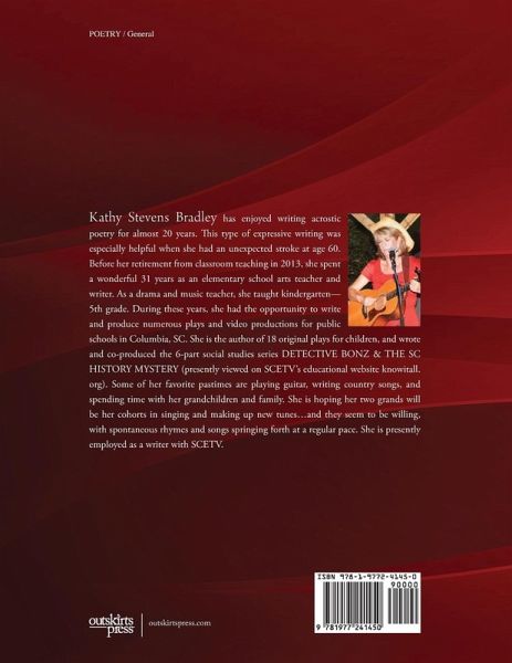 Kathy Stevens Bradley has enjoyed writing acrostic poetry for almost 20 years. This type of expressive writing was especially helpful when she had an unexpected stroke at age 60. Before her retirement from classroom teaching in 2013, she spent a wonderful 31 years as an elementary school arts teacher and writer. As a drama and music teacher, she taught kindergarten-5th grade. During these years, she had the opportunity to write and produce numerous plays and video productions for public schools in Columbia, SC. She is the author of 18 original plays for children, and wrote and co-produced the 6-part social studies series DETECTIVE BONZ & THE SC HISTORY MYSTERY (presently viewed on SCETV's educational website knowitall.org). Some of her favorite pastimes are playing guitar, writing country songs, and spending time with her grandchildren and family. She is hoping her two grands will be her cohorts in singing and making up new tunes...and they seem to be willing, with spontaneous rhymes and songs springing forth at a regular pace. She is presently employed as a writer with SCETV.