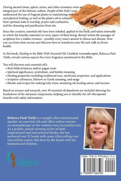 Since the creation, essential oils have been inhaled, applied to the body, and taken internally in which the benefits extended to every aspect of their being. Buried within the passages of scriptures lies a hidden treasure - possibly every man's answer to illness and disease. Now you can learn their secrets and discover how to transform your life and walk in divine health.In this book, Healing in the Bible With Essential Oil, Certified Aromatherapist, Rebecca Park Totilo, reveals various aspects for every fragrance mentioned in the Bible. You will discover each essential oil's: ¿ Rich biblical history and/or pagan roots ¿ Spiritual significance, symbolism, and hidden meaning ¿ Healing properties including traditional uses, medicinal properties, and applications ¿ Scripture references, Hebrew or Greek meaning, and usage ¿ Rituals and recipes for making holy water, anointing oil, healing salves, and incense Based on science and research, over 30 essential oil datasheets are included showing the breakdown of the chemical components, helping you to identify the oil's therapeutic benefits with safety information.