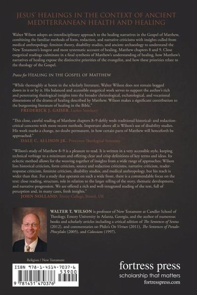 Although healing constitutes both a major theme of biblical literature and a significant practice of biblical communities, healing themes and experiences are not always conspicuous in presentations of biblical theology. Walter T. Wilson adopts an interdisciplinary approach to the healing narratives in the Gospel of Matthew, combining the familiar methods of form, redaction, and narrative criticisms with insights culled from medical anthropology, feminist theory, disability studies, and ancient archaeology. His focus is the New Testament's longest and most systematic account of healing, Matthew chapters 8 and 9, which he investigates by situating the text within a broad range of ancient healing traditions. The close exegetical readings of each healing narrative culminate in a final synthesis that pulls together what can be said about Matthew's understanding of healing, how Matthew's narratives of healing expose the distinctive priorities of the evangelist, and how these priorities relate to the theology of the Gospel as a whole.