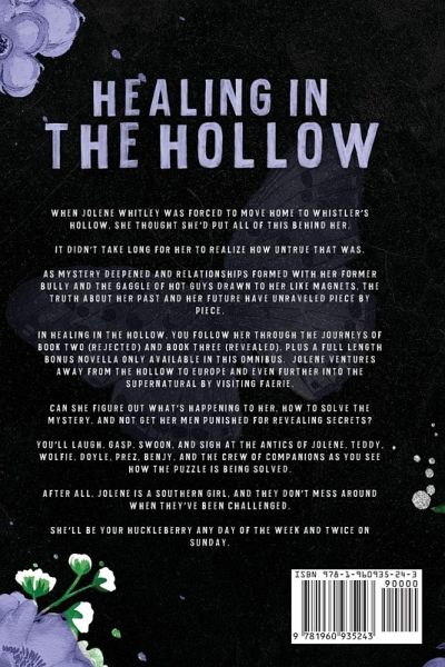 When Jolene Whitley was forced to move home to Whistler's Hollow, she thought she'd put all of this behind her. It didn't take long for her to realize how untrue that was. As mystery deepened and relationships formed with her former bully and the gaggle of hot guys drawn to her like magnets, the truth about her past and her future have unraveled piece by piece. In Healing in the Hollow, you follow her through the journeys of book two (Rejected) and book three (Revealed), plus a full length bonus novella only available in this omnibus. Jolene ventures away from the Hollow to Europe and even further into the supernatural by visiting Faerie. Can she figure out what's happening to her, how to solve the mystery, and not get her men punished for revealing secrets? You'll laugh, gasp, swoon, and sigh at the antics of Jolene, Teddy, Wolfie, Doyle, Prez, Benjy, and the crew of companions as you see how the puzzle is being solved. After all, Jolene is a Southern girl, and they don't mess around when they've been challenged. She'll be your Huckleberry any day of the week and twice on Sunday. (Note: This series can be read in individual order as books 1-6 or via the omnibuses 1-3. Books 4-6 and omnibus 3 are not yet released.)