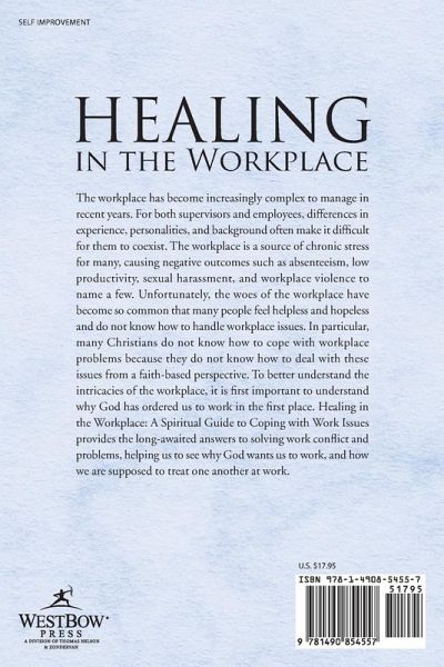 The workplace has become increasingly complex to manage in recent years. For both supervisors and employees, differences in experience, personalities, and background often make it difficult for them to coexist. The workplace is a source of chronic stress for many, causing negative outcomes such as absenteeism, low productivity, sexual harassment, and workplace violence to name a few. Unfortunately, the woes of the workplace have become so common that many people feel helpless and hopeless and do not know how to handle workplace issues. In particular, many Christians do not know how to cope with workplace problems because they do not know how to deal with these issues from a faith-based perspective. To better understand the intricacies of the workplace, it is first important to understand why God has ordered us to work in the first place. Healing in the Workplace: A Spiritual Guide to Coping with Work Issues provides the long-awaited answers to solving work conflict and problems, helping us to see why God wants us to work, and how we are supposed to treat one another at work.