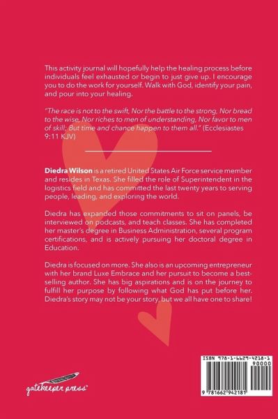 This activity journal will hopefully help start the healing process before individuals feel exhausted or begin to just give up. I encourage you to do the work for yourself. Walk with God, identify your pain and pour into your healing. "The race is not to the swift, Nor the battle to the strong, Nor bread to the wise, Nor riches to men of understanding, Nor favor to men of skill; But time and chance happen to them all." Ecclesiastes 9:11