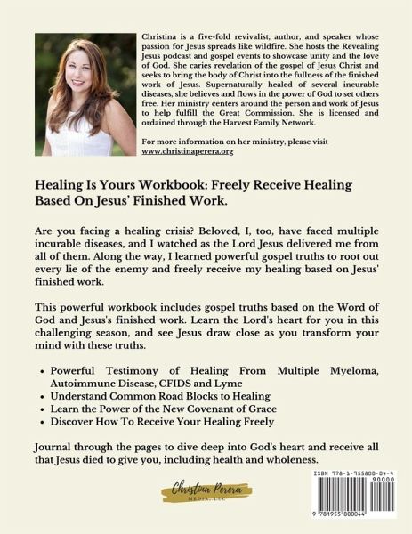 Are you facing a healing crisis? Beloved, I, too, have faced multiple incurable diseases, and I watched as the Lord Jesus delivered me from all of them. Along the way, I learned powerful gospel truths to root out every lie of the enemy and freely receive my healing based on Jesus' finished work. This powerful workbook includes gospel truths based on the Word of God and Jesus's finished work. Learn the Lord's heart for you in this challenging season, and see Jesus draw close as you transform your mind with these truths. Powerful Testimony of Healing From Multiple Myeloma, Autoimmune Disease, CFIDS and Lyme Understand Common Road Blocks to Healing Learn the Power of the New Covenant of Grace Discover How To Receive Your Healing Freely Journal through the pages to dive deep into God's heart and receive all that Jesus died to give you, including health and wholeness.