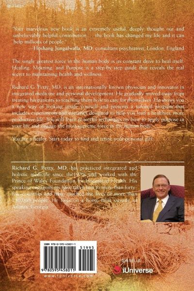 "Your marvelous new book is an extremely useful, deeply thought out and unbelievably helpful contribution . the book has changed my life and it can help millions of people." -Hoshang Jungalwalla, MD, consultant psychiatrist, London, England The single greatest force in the human body is its constant drive to heal itself. Healing, Meaning, and Purpose is a step-by-step guide that reveals the real secret to maintaining health and wellness. Richard G. Petty, MD, is an internationally known physician and innovator in integrated medicine and personal development. He gradually moved away from treating his patients to teaching them how to care for themselves. He shows you a new way of looking inside yourself and presents a tailored program that includes experiments and exercises designed to help you lead a healthier, more productive life. You will learn powerful techniques on how to apply purpose in your life and engage the most supreme force in the human body. You are a healer. Start today to find and refine your personal gift!
