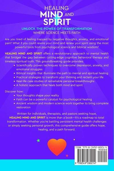 Healing Mind and Spirit: Cognitive Behavioral Therapy with Biblical Wisdom Transform Your Mind, Renew Your Spirit, and Reclaim Your Life Are you struggling with anxiety, depression, or destructive thought patterns that seem impossible to overcome? In this groundbreaking book, you'll discover how the scientifically-proven techniques of Cognitive Behavioral Therapy harmoniously align with timeless biblical wisdom to create a powerful approach to mental, emotional, and spiritual healing. What makes this book different: Bridges the gap between faith and psychology with a thoughtful, evidence-based approach Presents 10 powerful CBT techniques alongside relevant biblical principles that reinforce each strategy Features compelling real-life transformation stories that demonstrate these principles in action Includes practical worksheets, scripture-based affirmations, and step-by-step guidance Whether you're a mental health professional seeking to integrate faith into your practice, a pastor looking for evidence-based tools to help your congregation, or someone on your own healing journey, this comprehensive guide provides the roadmap you need. You'll learn how to: Transform negative thought patterns through the renewal of your mind Face fears with faith-infused courage rather than avoidance Activate positive behaviors even when motivation is lacking Find God's presence in the present moment through mindfulness Take captive every thought with proven cognitive control techniques Apply divine wisdom to life's problems through structured problem-solving Speak life-giving truth to yourself based on your identity in Christ Prepare for trials with stress inoculation grounded in spiritual strength Build Christ-centered relationships through enhanced social skills Find deep peace through systematic desensitization paired with spiritual practices Don't let anxiety, depression, or negative thinking rob you of the abundant life you were created to live. The integration of cutting-edge psychological science with ancient biblical truths offers a pathway to transformation that addresses your whole being-mind, emotion, behavior, and spirit. Begin your journey toward healing today.