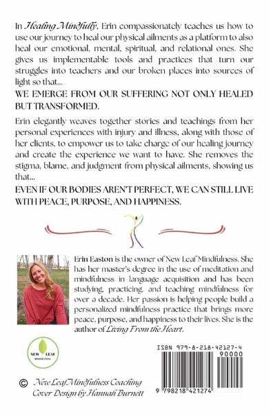 In Healing Mindfully, Erin compassionately teaches us how to use our journey to heal our physical ailments as a platform to also heal our emotional, mental, spiritual, and relational ones. She gives us implementable tools and practices that turn our struggles into teachers and our broken places into sources of light so that we emerge from our suffering not only healed but transformed. Erin elegantly weaves together stories and teachings from her personal experience with injuries and illness along with those of her clients to empower us to take charge of our healing journey and create the experience we want to have. She removes the stigma, blame, and judgment from physical ailments showing us that even if our bodies aren't perfect, we can still live with peace, purpose, and happiness.