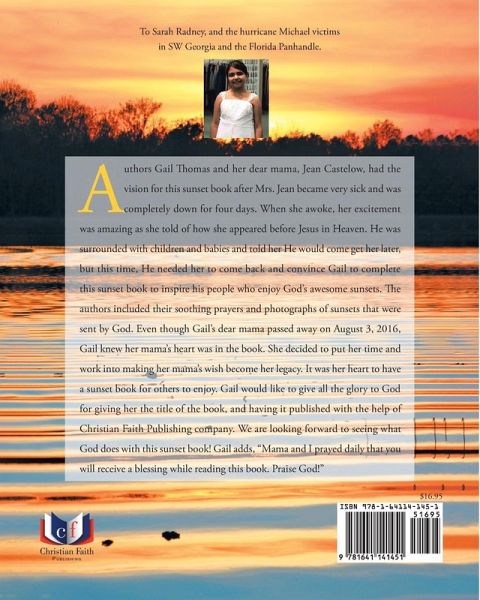 Authors Gail Thomas and her dear mama, Jean Castelow, had the vision for this sunset book after Mrs. Jean became very sick and was completely down for four days. When she awoke, her excitement was amazing as she told of how she appeared before Jesus in Heaven. He was surrounded with children and babies and told her He would come get her later, but this time, He needed her to come back and convince Gail to complete this sunset book to inspire his people who enjoy God's awesome sunsets. The authors included their soothing prayers and photographs of sunsets that were sent by God. Even though Gail's dear mama passed away on August 3, 2016, Gail knew her mama's heart was in the book. She decided to put her time and work into making her mama's wish become her legacy. It was her heart to have a sunset book for others to enjoy. Gail would like to give all the glory to God for giving her the title of the book, and having it published with the help of Christian Faith Publishing company. We are looking forward to seeing what God does with this sunset book! Gail adds, "Mama and I prayed daily that you will receive a blessing while reading this book. Praise God!"