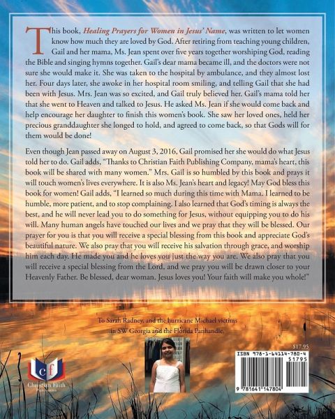 This book, Healing Prayers for Women in Jesus' Name, was written to let women know how much they are loved by God. After retiring from teaching young children, Gail and her mama, Ms. Jean spent over five years together worshiping God, reading the Bible and singing hymns together. Gail's dear mama became ill, and the doctors were not sure she would make it. She was taken to the hospital by ambulance, and they almost lost her. Four days later, she awoke in her hospital room smiling, and telling Gail that she had been with Jesus. Mrs. Jean was so excited, and Gail truly believed her. Gail's mama told her that she went to Heaven and talked to Jesus. He asked Ms. Jean if she would come back and help encourage her daughter to finish this women's book. She saw her loved ones, held her precious granddaughter she longed to hold, and agreed to come back, so that Gods will for them would be done! Even though Jean passed away on August 3, 2016, Gail promised her she would do what Jesus told her to do. Thanks to Faith Christian Publishing Company, mama's heart, this book will be shared with many women. Mrs. Gail is so humbled by this book and prays it will touch women's lives everywhere. It is also Ms. Jean's heart and legacy! May God bless this book for women! Gail adds, "I learned so much during this time with Mama. I learned to be humble, more patient, and to stop complaining. I also learned that God's timing is always the best, and he will never lead you to do something for Jesus, without equipping you to do his will. Many human angels have touched our lives and we pray that they will be blessed. Our prayer for you is that you will receive a special blessing from this book and appreciate God's beautiful nature. We also pray that you will receive his salvation through grace, and worship him each day. He made you and he loves you just the way you are. We also pray that you will receive a special blessing from the Lord, and we pray you will be drawn closer to your Heavenly Father. Be blessed, dear woman. Jesus loves you! Your faith will make you whole!"