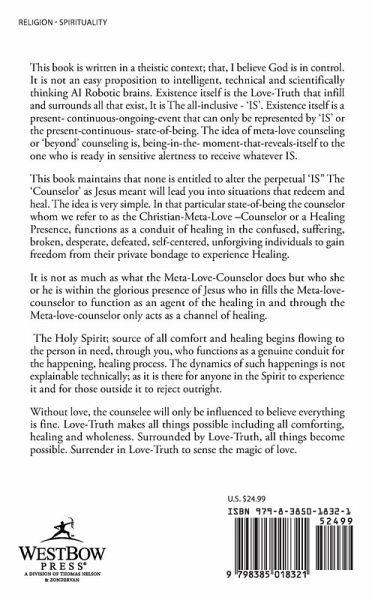 This book is written in a theistic context; that, I believe God is in control. It is not an easy proposition to intelligent, technical and scientifically thinking AI Robotic brains. Existence itself is the Love-Truth that infill and surrounds all that exist, It is The all-inclusive - 'IS'. Existence itself is a present- continuous-ongoing-event that can only be represented by 'IS' or the present-continuous- state-of-being. The idea of meta-love counseling or 'beyond' counseling is, being-in-the- moment-that-reveals-itself to the one who is ready in sensitive alertness to receive whatever IS. This book maintains that none is entitled to alter the perpetual 'IS" The 'Counselor' as Jesus meant will lead you into situations that redeem and heal. The idea is very simple. In that particular state-of-being the counselor whom we refer to as the Christian-Meta-Love -Counselor or a Healing Presence, functions as a conduit of healing in the confused, suffering, broken, desperate, defeated, self-centered, unforgiving individuals to gain freedom from their private bondage to experience Healing. It is not as much as what the Meta-Love-Counselor does but who she or he is within the glorious presence of Jesus who in fills the Meta-love-counselor to function as an agent of the healing in and through the Meta-love-counselor only acts as a channel of healing. The Holy Spirit; source of all comfort and healing begins flowing to the person in need, through you, who functions as a genuine conduit for the happening, healing process. The dynamics of such happenings is not explainable technically; as it is there for anyone in the Spirit to experience it and for those outside it to reject outright. Without love, the counselee will only be influenced to believe everything is fine. Love-Truth makes all things possible including all comforting, healing and wholeness. Surrounded by Love-Truth, all things become possible. Surrender in Love-Truth to sense the magic of love.