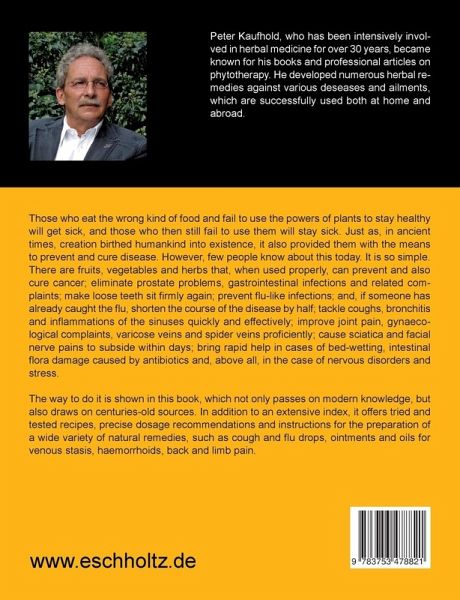 Those who eat the wrong kind of food and fail to use the powers of plants to stay healthy will get sick, and those who then still fail to use them will stay sick. Just as, in ancient times, creation birthed humankind into existence, it also provided them with the means to prevent and cure disease. However, few people know about this today. It is so simple. There are fruits, vegetables and herbs that, when used properly, can prevent and also cure cancer; eliminate prostate problems, gastrointestinal infections and related complaints; make loose teeth sit firmly again; prevent flu-like infections; and, if someone has already caught the flu, shorten the course of the disease by half; tackle coughs, bronchitis and inflammations of the sinuses quickly and effectively; improve joint pain, gynaecological complaints, varicose veins and spider veins proficiently; cause sciatica and facial nerve pains to subside within days; bring rapid help in cases of bed-wetting, intestinal flora damagecaused by antibiotics and, above all, in the case of nervous disorders and stress.The way to do it is shown in this book, which not only passes on modern knowledge, but also draws on centuries-old sources. In addition to an extensive index, it offers tried and tested recipes, precise dosage recommendations and instructions for the preparation of a wide variety of natural remedies, such as cough and flu drops, ointments and oils for venous stasis, haemorrhoids, back and limb pain.