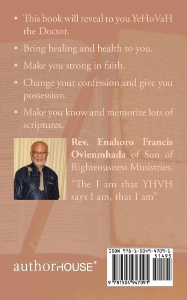 This book will reveal to you YeHoVaH the Doctor. Bring healing and health to you. Make you strong in faith. Change your confession and give you possession. Make you know and memorize lots of scriptures. Rev. Enahoro Francis Ovienmhada of Sun of Righteousness Ministries. "The I am that YHVH says I am, that I am"