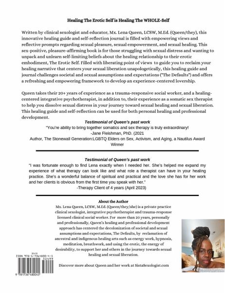 Empower your erotic intelligence by getting rid of self-limiting beliefs about your self-worth, your desirability, & ability to give and receive love. Created by a somatic sex therapist, Healing the Erotic Self is a workbook filled with self-reflection prompts, journaling exercises, and the somatic healing practice, SHIFT, that support your efforts to reconnect to your wholeness by creating an empowering healing narrative and reclaiming your relationship to your self-worth, self-love, and pleasure. Move from self-awareness to erotic mindfulness by learning how to use the erotic to create affirming and compassionate presence practice for every day living. Whether you are a trauma survivor or a survivor who is also a healing & helping professional, Healing the Erotic Self Workbook supports your journey of erotic liberation. Whether you are a trauma survivor or a survivor who is also a healing & helping professional, this workbook for sexual shadow work, Healing the Erotic Self, supports your journey of erotic liberation.