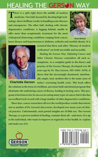 Healing the Gerson Way, is written in an easy-to-read style with step-by-step instructions for implementing the Gerson Therapy. While it is best known for its success in aiding people to heal many types of cancer, Gerson Therapy has an excellent track record in helping to overcome virtually all other degenerative and chronic diseases. Charlotte & Beata clarify the science of The Gerson Therapy and clearly demonstrate why our chemical filled, nutritionally empty, modern diet is a fundamental cause of today's worsening health crisis. Most of all, it offers a natural and powerful nutritional…mehr
