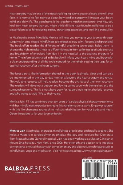 Heart surgery may be one of the most challenging events you or a loved one will ever face. It is normal to feel nervous about how cardiac surgery will impact your body, mind and daily life. The good news is that you have much more control over how you heal from heart surgery than you might think.Millions have found mindfulness to be a powerful practice for reducing stress, enhancing attention, and instilling tranquility.In Healing the Heart Mindfully, Monica will help you navigate your journey through surgery with time-tested mindfulness techniques to stay calm, focused and grounded. The book offers readers the different mindful breathing techniques, helps them to choose the right mindset, how to differentiate pain from suffering, gratitude exercise and breakdown of exercises from day 1 in the hospital to the exercise program for home. The information shared in this book will infuse your heart, mind and body with a clear understanding of all the tools needed for the rehab, setting the stage for an optimal recovery after the heart surgery. The best part is, the information shared in the book is simple, clear and can also be implemented in the day to day moments beyond the heart surgery and rehab. This valuable resource will help readers become the architect of their own recovery. The readers will develop a more deeper and loving connection with themselves and the surrounding world. This is a must have book for readers looking for a holistic recovery and who wants to add "life to their years" Monica Jain, PT has combined over ten years of cardiac physical therapy experience with her mindfulness expertise to create this transformational work. Empower yourself with this life-changing approach to holistic rehabilitation for your body and heart. Open the pages to let your journey begin...