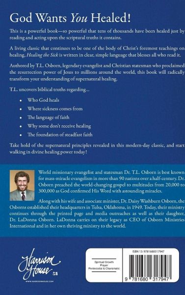 God Wants You Healed! This is a powerful book-so powerful that tens of thousands have been healed just by reading and acting upon the scriptural truths it contains. A living classic that continues to be one of the body of Christ's foremost teachings on healing, Healing the Sick is written in clear, simple language that blesses all who read it. Authored by T.L. Osborn, legendary evangelist and Christian statesman who proclaimed the resurrection power of Jesus to millions around the world, this book will radically transform your understanding of supernatural healing. T.L. uncovers biblical truths regarding... Who God heals Where sickness comes from The language of faith Why some don't receive healing The foundation of steadfast faith Take hold of the supernatural principles revealed in this modern-day classic, and start walking in divine healing power today!