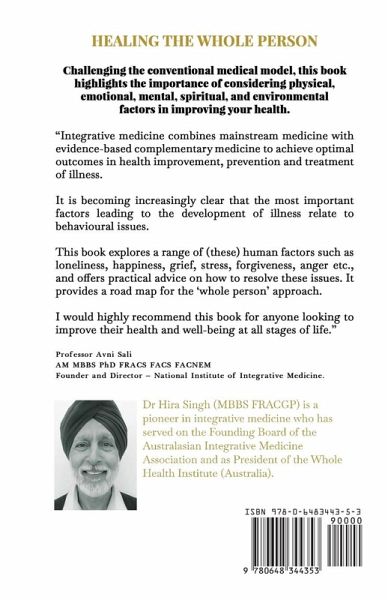 Challenging the conventional medical model, this book highlights the importance of considering physical, emotional, mental, spiritual, and environmental factors in improving your health. Integrative medicine combines mainstream medicine with evidence-based complementary medicine to achieve optimal outcomes in health improvement, prevention and treatment of illness. It is becoming increasingly clear that the most important factors leading to the development of illness relate to behavioural issues. A key part of integrative medicine has to do with why a person has developed their illness, hence providing the best opportunity for the patient's healing. Healing the Whole Person explores a range of (these) human factors such as loneliness, happiness, grief, stress, forgiveness, anger etc., and offers practical advice on how to resolve these issues. It provides a road map for the 'whole person' approach. This book offers us simple, effective ways we can all follow to improve our lifestyle for health optimisation and personal growth. It provides a road map for the 'whole person' approach, which offers the best that all medicine has to offer.