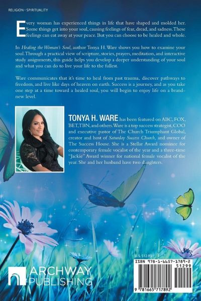 Every woman has experienced things in life that have shaped and molded her. Some things get into your soul, causing feelings of fear, dread, and sadness. These feelings can eat away at your peace. But you can choose to be healed and whole. In Healing the Woman's Soul, author Tonya H. Ware shows you how to examine your soul. Through a practical view of scripture, stories, prayers, meditation, and interactive study assignments, this guide helps you develop a deeper understanding of your soul and what you can do to live your life to the fullest. Ware communicates that it's time to heal from past trauma, discover pathways to freedom, and live like days of heaven on earth. Success is a journey, and as you take one step at a time toward a healed soul, you will begin to enjoy life on a brand-new level.